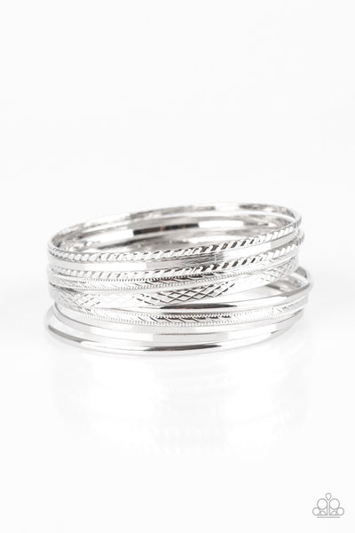 Featuring smooth and textured finishes, a collection of mismatched silver, rose gold, and gunmetal bangles stack across the wrist for a classic look.