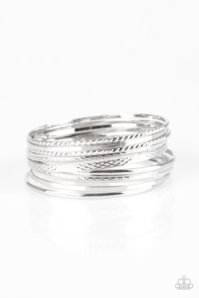 Featuring smooth and textured finishes, a collection of mismatched silver bangles stack across the wrist for a classic look.
