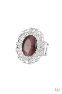 Encrusted in dainty white rhinestones, a frilly silver frame spins around a glowing purple moonstone center for a regal look. Features a stretchy band for a flexible fit.