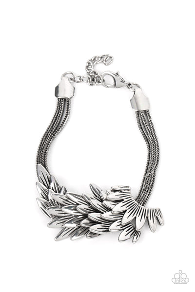 Feathery silver frames delicately overlap across the center of the wrist, creating a boa-like centerpiece atop rows of rustic silver chains. Features an adjustable clasp closure.