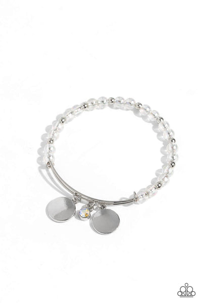 Featuring a subtle iridescent shimmer, a collection of glassy light blue, dark blue, and turquoise beads are infused along the wrist besides dainty silver studs for a bodacious pop of color. Two silver discs and a blue iridescent gem slide along a sleek bar fitting on the dainty silver bangle, creating a sentimental statement. Due to its prismatic palette, color may vary.
