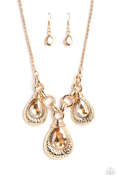 Oversized links of gold are artfully interlocked, laying the groundwork for a dynamic display of industrial grit. A trio of oversized champagne, faceted, teardrop gems drips from the chain links above, each set inside a textured gold frame topped with a stack of gold rings. The metallic mashup is suspended from a gold ball chain, introducing a hint of unexpected homespun character to the statement-making design. Features an adjustable clasp closure.