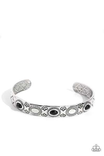 A trio of oval black beads are pressed into the centers of shimmery sunbursts stamped across the front of a dainty silver cuff radiating with desert patterns, creating an earthy pop of color around the wrist.