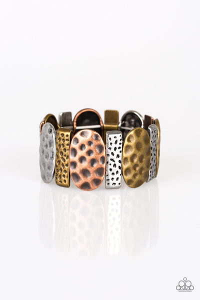 Delicately hammered in antiqued detail, round and rectangular shaped frames are threaded along stretchy bands, creating a bold tribal look around the wrist.