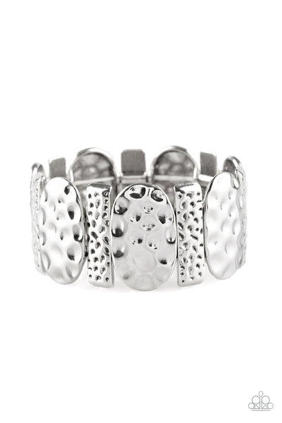 Delicately hammered in antiqued detail, round and rectangular shaped frames are threaded along stretchy bands, creating a bold tribal look around the wrist.