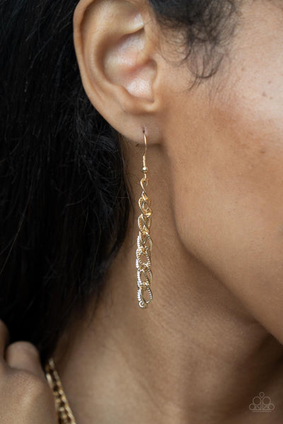 Bold layers of glistening gold chain of varying sizes and textures, fall like a weighty medal across the chest creating a shimmering industrial effect. Features an adjustable clasp closure.