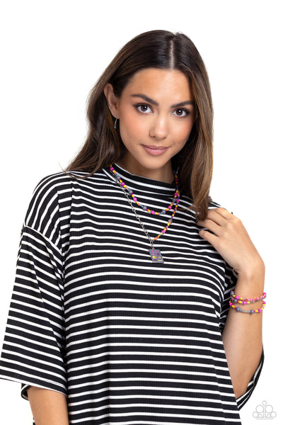 Featuring a mismatched finish, a collection of gray, orange, yellow, purple, and Rose Violet seed beads with various silver accents trickle along elastic stretchy bands for a trendy display.