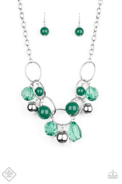 Infused with faceted Ultramarine Green crystal-like beads, a bubbly collection of oversized silver and Ultramarine Green beads swing from the bottom of an interconnected row of bold silver oval frames, creating a colorful fringe below the collar. Features an adjustable clasp closure.
