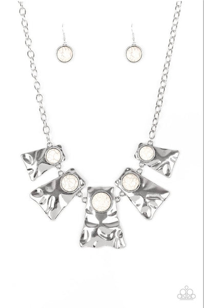 Rippling with hammered details, flared silver frames join below the collar, creating a fierce fringe. Refreshing white stones are pressed into the tops of the frames for a colorful finish. Features an adjustable clasp closure.