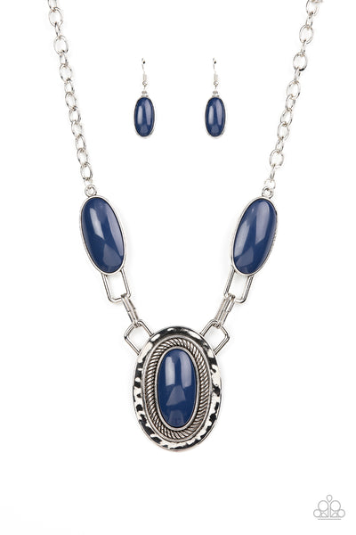 Featuring abstract square fittings, a pair of oblong navy blue beaded frames link to a dramatically oversized silver pendant below the collar. Bordered in rope-like texture, the hammered pendant features a matching navy blue bead for a powerful pop of color. Features an adjustable clasp closure.