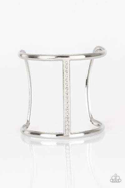Glassy white rhinestones are encrusted down the spine of an airy silver cuff for an edgy look.