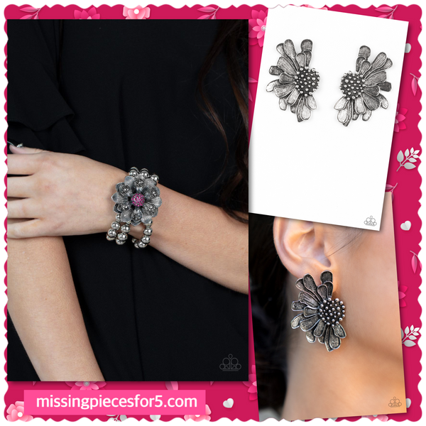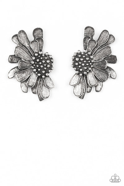 Imperfect silver petals bloom from a studded center, layering into a rustic half blossom for a whimsical flair. Earring attaches to a standard post fitting.