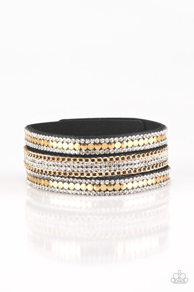 Rows of flat gold discs, glassy white rhinestones, and shimmery gold chains are encrusted along black suede bands for a sassy look. Features an adjustable snap closure.