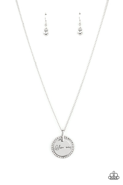 Infused with a silver ring of glassy white rhinestones, a glistening silver disc is dotted with a dainty white rhinestone and stamped in the word, "Glamma," as it swings below the collar for a glamorously sentimental look. Features an adjustable clasp closure.