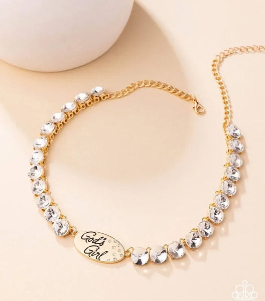 Infused along a classic gold chain, a flashy collection of gold-pronged white gems shimmer and shine down the neckline to an oval gold plate. The phrase "God's Girl" is stamped in a curly font on the plate beside a dusting of dainty white rhinestones for an inspirational finish. Features an adjustable clasp closure.