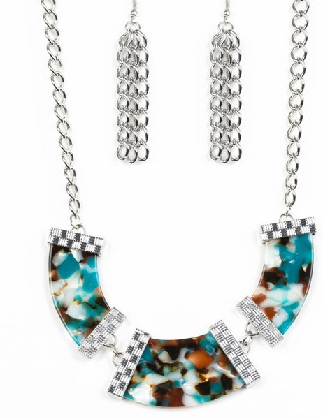 Speckled with color, a trio of blue acrylic frames are nestled inside checker textured silver fittings as they link below the collar for a seasonal flair. Features an adjustable clasp closure.