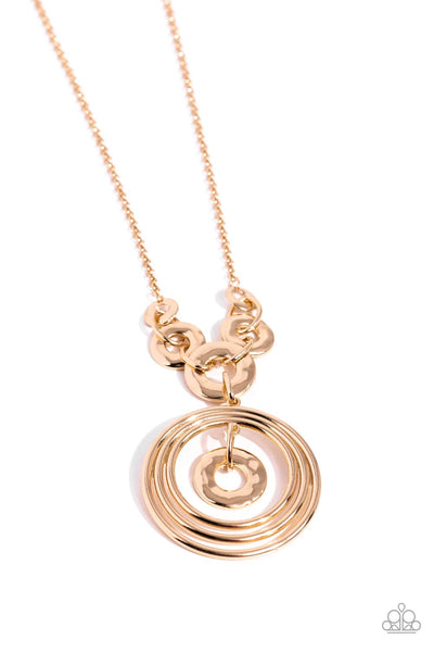 A trio of high-sheen gold rings swings from the bottom of a collection of hammered, gold hoops connected to an elongated chain in the same hue, creating an asymmetrically stacked pendant. A hammered gold ring swings in the center of the shiny rings, creating additional monochromaticity. Features an adjustable clasp closure.