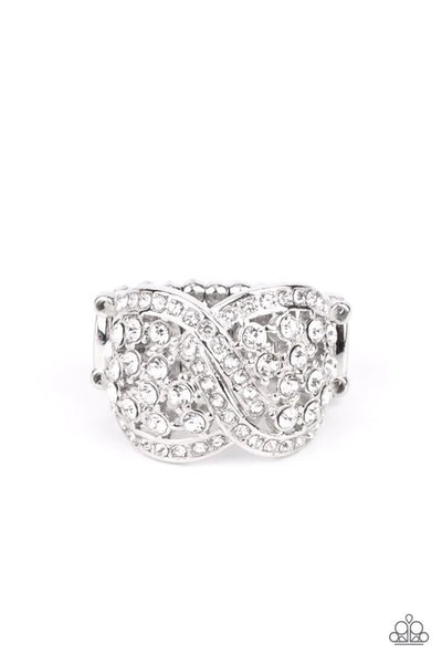 Intertwining white rhinestone encrusted silver bars delicately connect around clusters of glittery white rhinestones, creating a sparkly infinity across the finger. Features a stretchy band for a flexible fit.