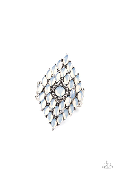 Featuring regal marquise style cuts, rows of iridescent cat's eye stone beads stack around a round cat's eye stone beaded center, creating an ethereal centerpiece atop the finger. Features a stretchy band for a flexible fit.