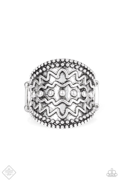 Studded and zigzagging textures are embossed across the front of a thick silver band for a tribal flair. Features a stretchy band for a flexible fit.
