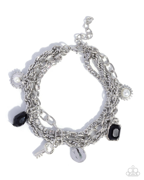 Pressed in silver square fittings, a collection of white rhinestones joins a silver cable and singapore chain along the wrist for a mismatched display. A collection of elegant charms, including a hammered silver disc, a silver key, a black teardrop bead, a black emerald-cut bead, a white pearl in a silver sunburst frame, and a dainty white pearl in an elevated silver-studded frame, sways from the cable chain strand for an eye-catching finish. Features an adjustable clasp closure.