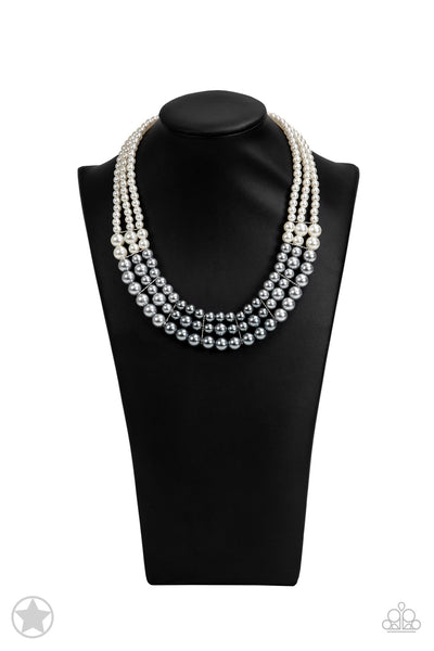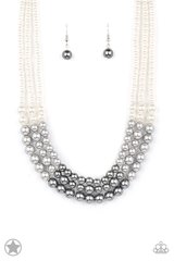 Strands of white, silver, and dark gray pearls elegantly drape below the collar, creating a beautiful ombre effect. Sectioned by silver accents, the luminescent pearls radiantly fall into a glamorous cascade. Features an adjustable clasp closure.
