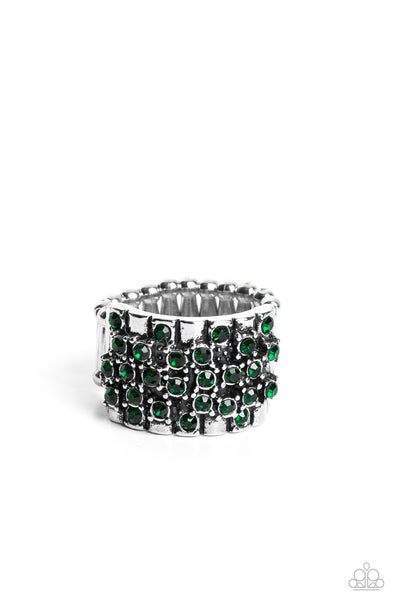 Layers of linear silver textures are accented with an explosion of dainty, emerald rhinestones, adding a touch of glam to the gritty design. Dainty duos of the green rhinestones layer next to the edgy silver layers for additional sparkle. Features a stretchy band for a flexible fit.