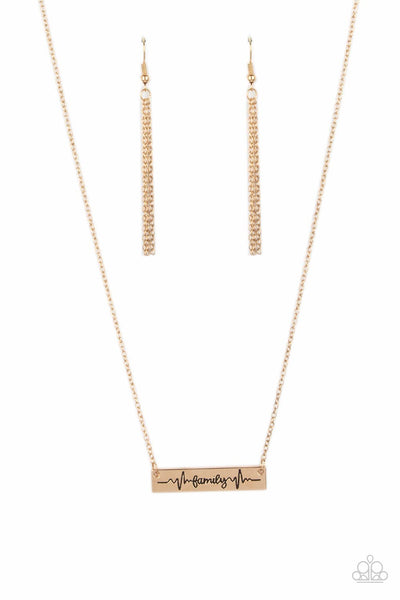 The word "Family," is inscribed between symbolic life lines on a shining rectangular gold plate creating an affectionate keepsake on a dainty gold chain below the collar. Features an adjustable clasp closure.