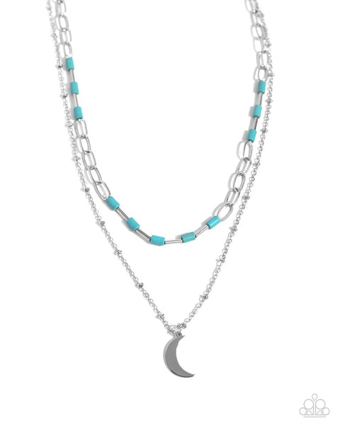 Adorn your neckline with this enchanting piece featuring a strand of shimmering turquoise and silver beads elegantly infused along a silver paperclip chain. Beneath, a delicate silver chain showcases a crescent moon charm, enhancing the organic allure. Its adjustable clasp ensures a perfect fit. Embrace the uniqueness of natural stones, where delightful color variations are a charming aspect of this design.