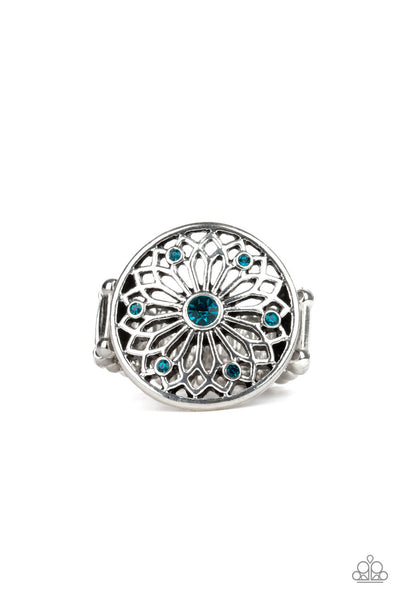Glittery blue rhinestones are sprinkled across a shimmery floral center, creating a whimsical mandala-like frame atop the finger. Features a stretchy band for a flexible fit.