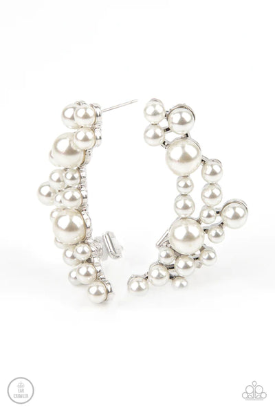 A collection of bubbly white pearls dot a shiny silver frame that branches up the ear for a modern, timeless twist. Earring attaches to a standard post fitting. Features a clip-on fitting at the top for a secure fit.