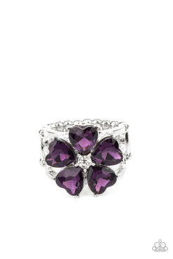 Glittery heart-shaped purple rhinestones bloom from a dainty white rhinestone center, creating a sparkly floral centerpiece atop layered silver bands. Features a stretchy band for a flexible fit.