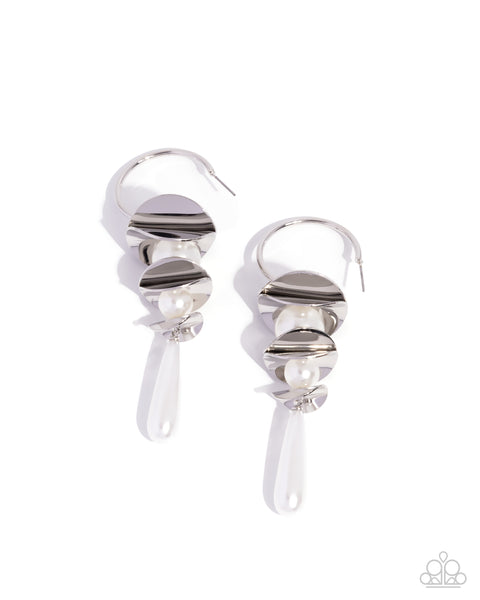 Emerging from slightly pinched, hammered silver discs, a collection of glossy white pearls gradually decreases in size until it extends into an elongated teardrop white pearl that sways from a classic silver hoop for an ethereally refined lure. Earring attaches to a standard post fitting. Hoop measures approximately 1" in diameter.