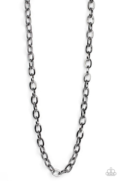 A dramatically oversized collection of oval gunmetal links boldly interlock across the chest, resulting in an intense industrial centerpiece. Features an adjustable clasp closure.