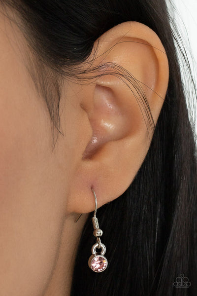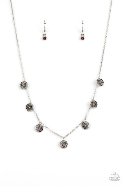 Whimsical antiqued silver floral medallions, dotted with dainty light rose rhinestone centers, dangle from a petite silver chain resulting in a charming allure below the collar. Features an adjustable clasp closure.