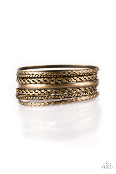 Featuring an array of tribal inspired textures, mismatched brass bangles stack across the wrist for a seasonal look.