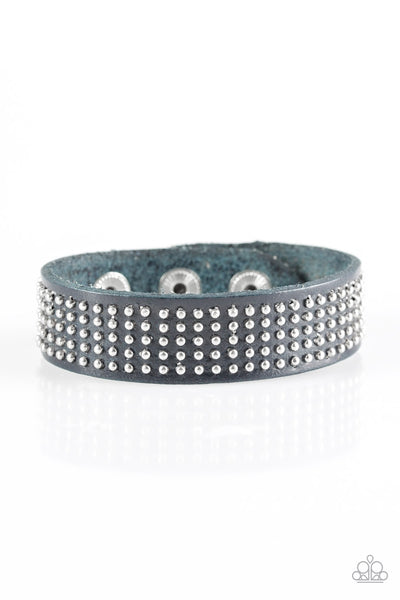 Dainty metallic beads are pressed across the front of a blue leather band for a rugged look. Features an adjustable snap closure.