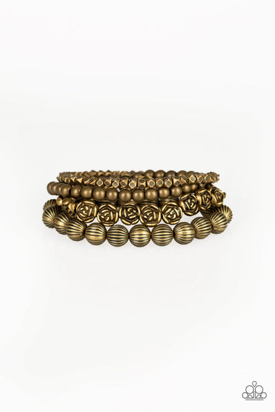 A collection of brass roses, ornate brass beads, and dainty brass accents are threaded along stretchy bands, creating whimsical layers around the wrist.