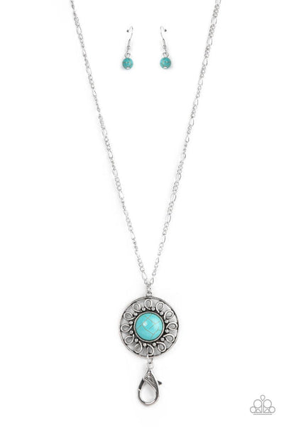 An oversized turquoise stone adorns the center of an antiqued silver frame radiating with silver studded and wire-like detail, creating an authentic artisan inspired pendant. A lobster clasp hangs from the bottom of the design to allow a name badge or other item to be attached. Features an adjustable clasp closure.