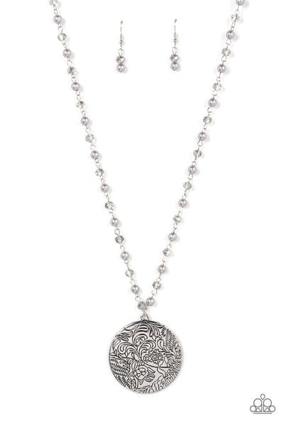 Stamped in a floral motif, an oversized silver medallion blooms from the bottom of an extended silver chain adorned with silver pearls and smoky crystal-like beads for a whimsical flair. Features an adjustable clasp closure.