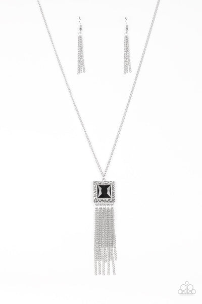 Swinging from the bottom of a lengthened gunmetal chain, a delicately hammered square frame gives way to a shimmery gunmetal fringe. Featuring a regal square cut, a glittery black gem is pressed into the center of the pendant for an edgy look. Features an adjustable clasp closure.