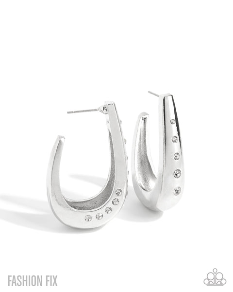 Dainty white rhinestones that gradually increase in size and dimension tumble down the side and front of a glistening, silver, rounded square hoop for a happy blast of sparkle. Earring attaches to a standard post fitting. Hoop measures approximately 1 1/2" in diameter.
