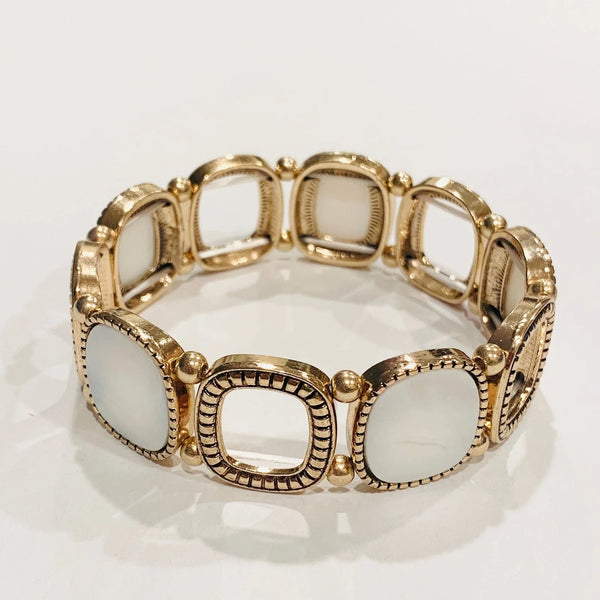 Infused with rounded white shells, delicately twist-textured gold frames alternate around the wrist along a stretchy band for a coastally chic look. Dainty gold beads frame both sides of the frame separating each stylish frame for additional warmth and detail.