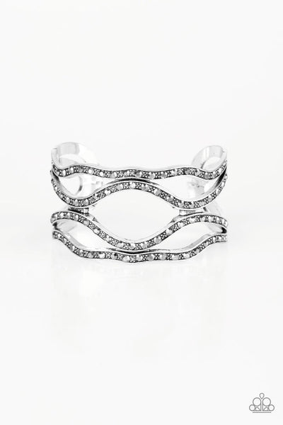 Encrusted in glittery hematite rhinestones, dotted silver bars wind across the wrist, coalescing into an edgy cuff.
