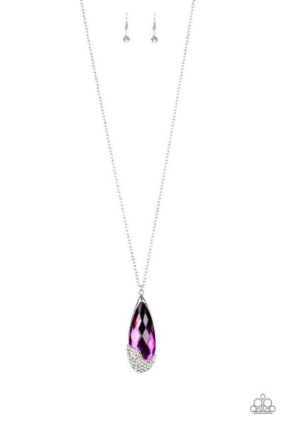 A white rhinestone encrusted frame and smooth silver frame overlap at the top of a faceted pink teardrop gem, creating a dramatic pendant. The refined pendant swings from the bottom of a rounded snake chain for a sleek finish. Features an adjustable clasp closure.