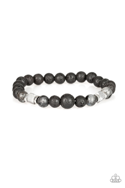 Infused with dainty silver accents, a collection of faceted cube beads, refreshing stone beads, and earthy lava rock beads are threaded along a stretchy band around the wrist for a seasonal look.