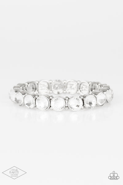 Infused with dainty silver beads, glassy white rhinestone encrusted frames are threaded along stretchy bands around the wrist for a glamorous look.