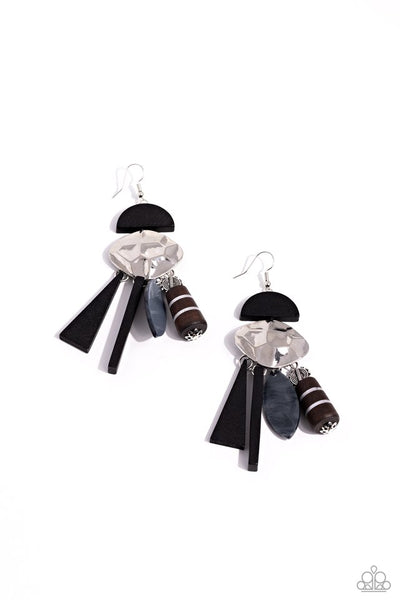 Featuring a variety of textures, patterns, and sheens, black half-moon and hammered abstract frames stack into an exotic-inspired lure. Textured, striped, shell, acrylic, and wooden accents in mainly black hues dangle from the stacked lure for a trendy fringe. Earring attaches to a standard fishhook fitting.