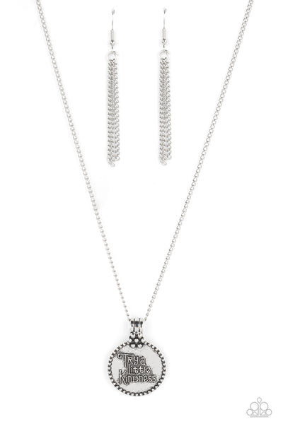 Silver studs coalesce around an antiqued silver pendant with the words, "Try a Little Kindness", embossed at its center. An abstract flower, created from silver studs, blooms at the top of the pendant in a hopeful finish. Features an adjustable clasp closure.
