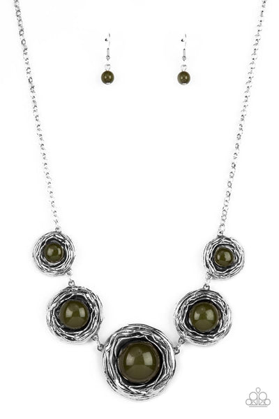Gradually increasing in size, a bubbly collection of oversized Olive Branch beads adorn the centers of folds of silver buds below the collar for a seasonal fashion. Features an adjustable clasp closure.
